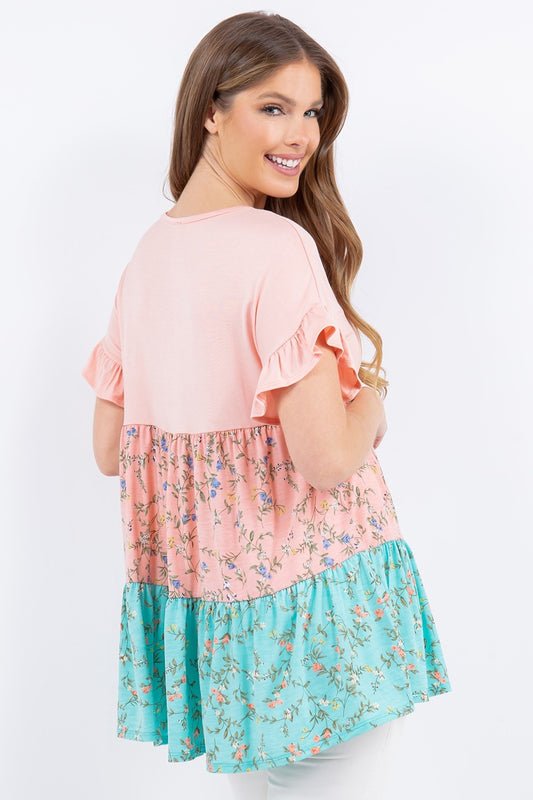 Celeste Full Size Floral Color Block Ruffled Short Sleeve Top
